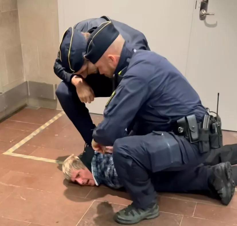 Kort efter brottades Zachrisson ned på golvet och två av de tre poliserna höll nere honom mot marken. Carlbom skriver på Instagram: