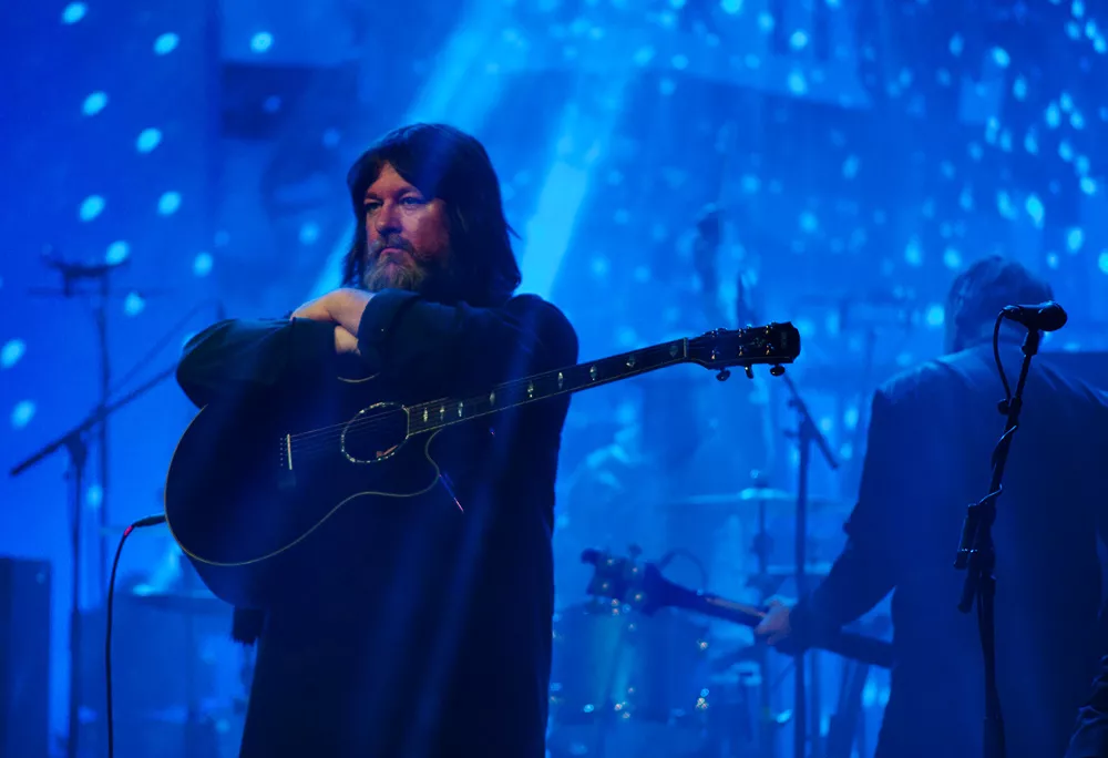 Och först, den obligatoriska, skamlösa nostalgitrippen. Utdrag från bandets karriär flimrar förbi över en stor vit filmduk som täcker den egentliga scenen. Om en liten stund skall den verkliga konserten träda i kraft, snart skall den vita duken lyfta. Spänningen ligger likt ett töcken runt omkring