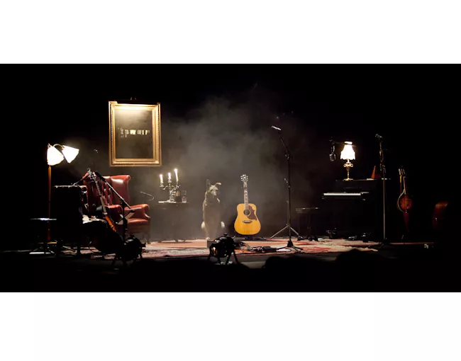 Scenen på Palladium kan ganska exakt beskrivas som att äntra en förmögen, äldre mans dunkla vardagsrum, en lika dunkel kväll på vinterhalvåret. En soffa i mörkt brunt tyg, en naken glödlampa, ett par flämtande ljus, en vinflaska, två glas och en tavla, allt detta har placerats ut bakom kvällens