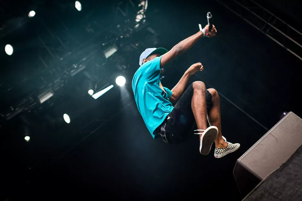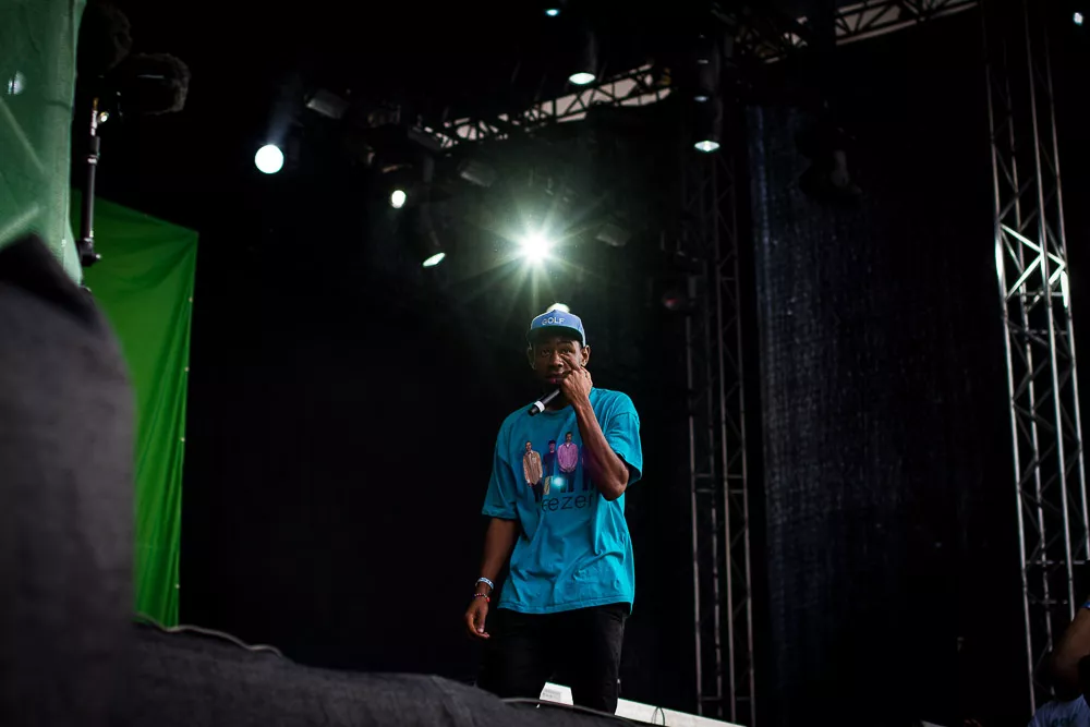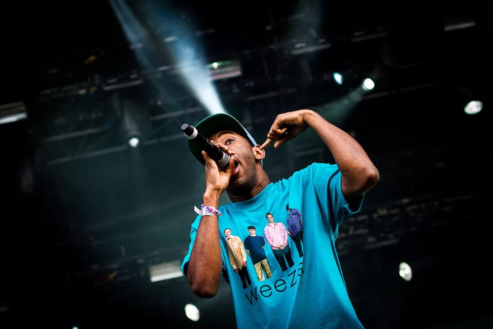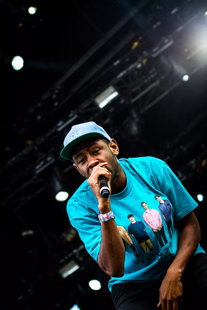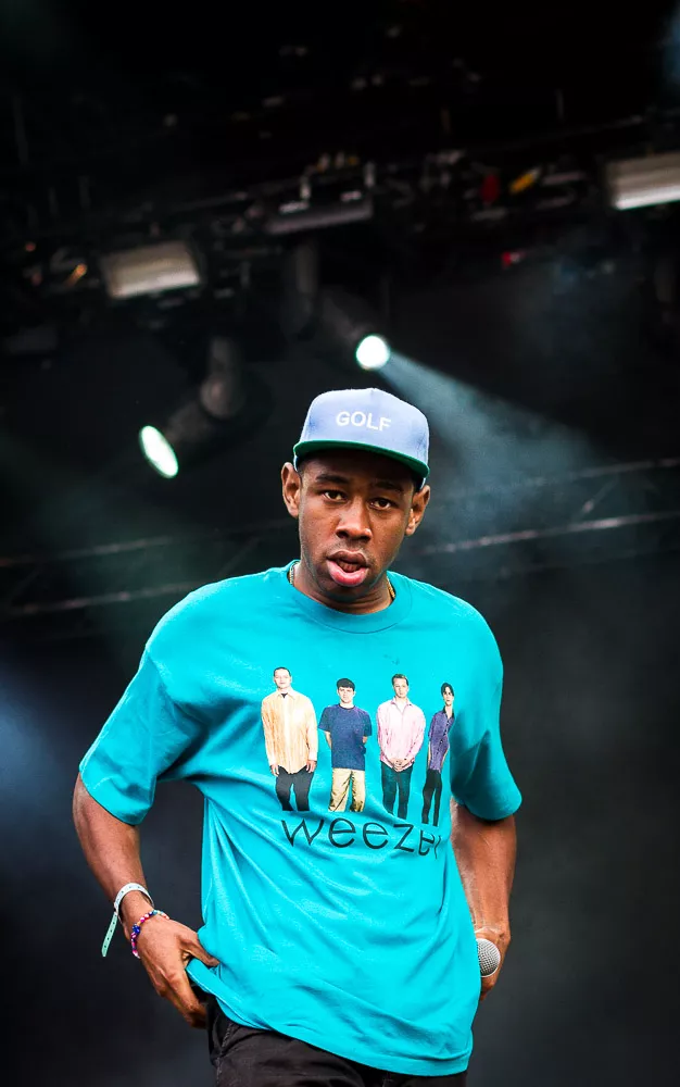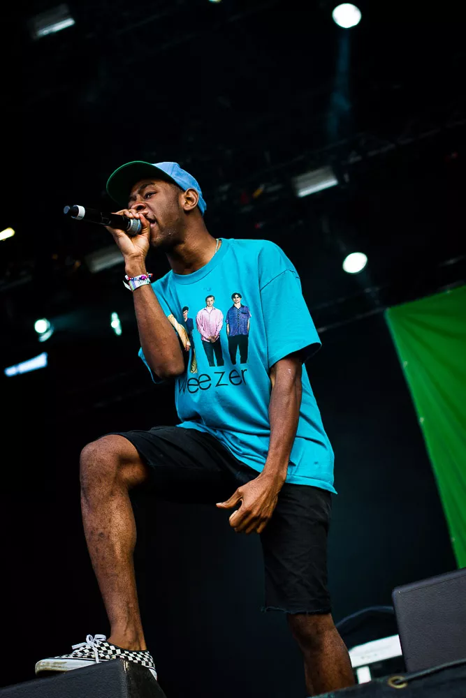 Förvirrat är nog inte riktigt helt rätt ord, de vet ändå ungefär vad det är som pågår och vad de ska göra, kanske även exakt var de är. Men det är ändå en rätt tafatt stämning på scen när Tyler The Creator släntrar ut i en turkos Weezer-tröja och viftar lite lojt mot publiken, med Taco