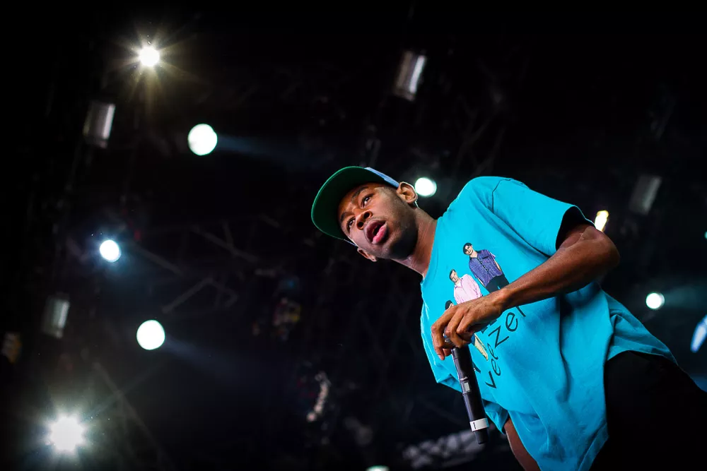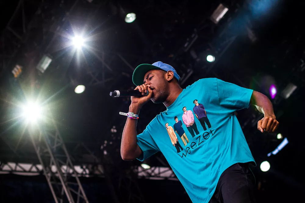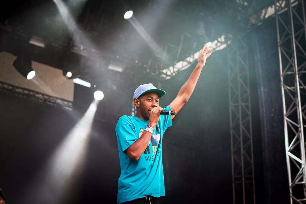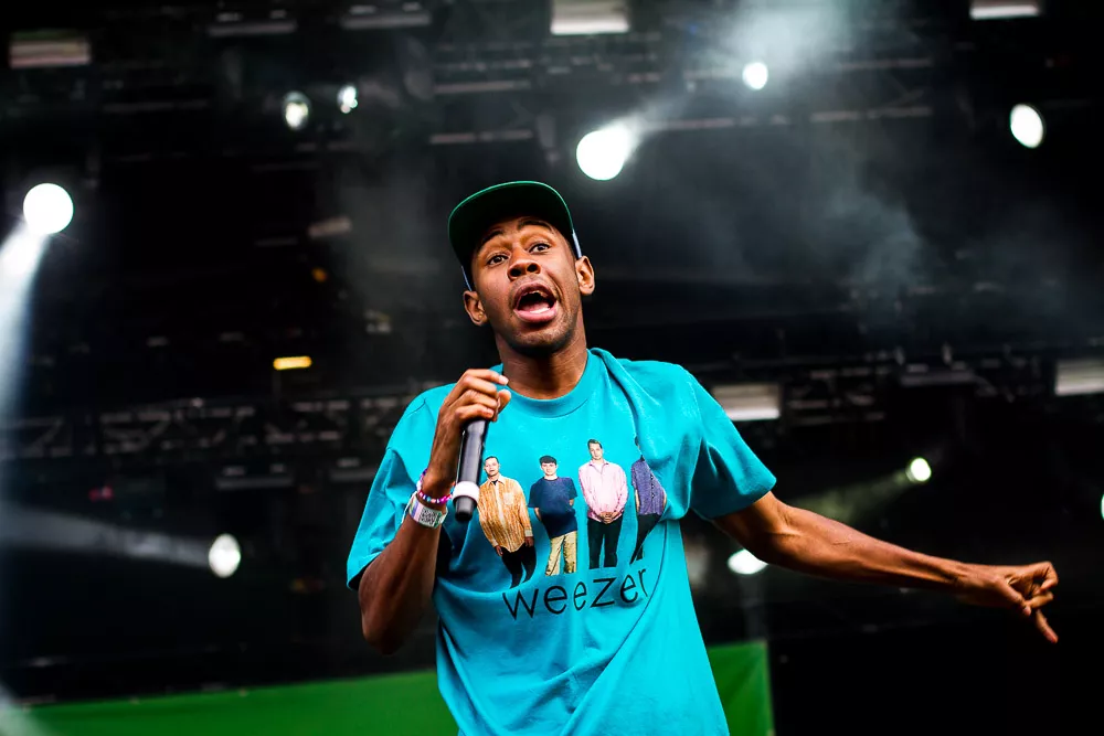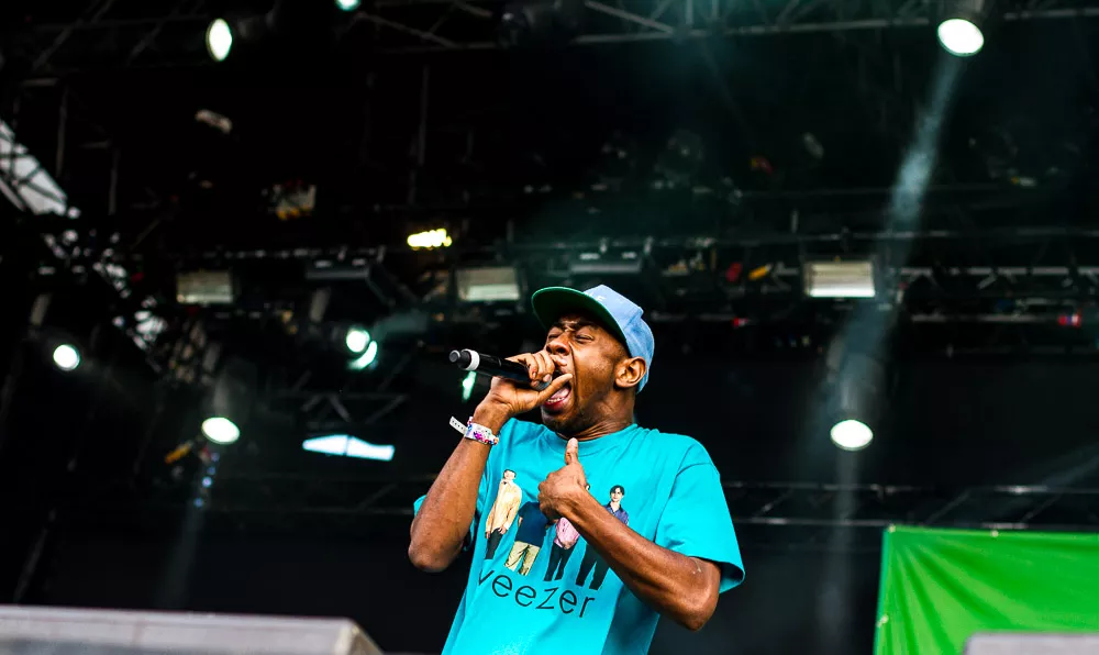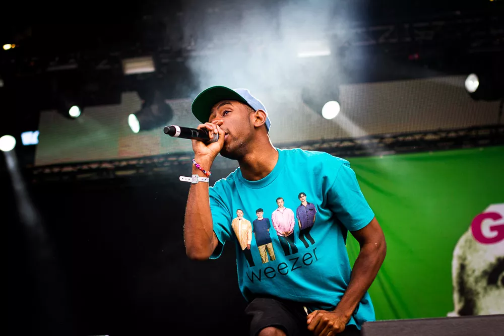 Förvirrat är nog inte riktigt helt rätt ord, de vet ändå ungefär vad det är som pågår och vad de ska göra, kanske även exakt var de är. Men det är ändå en rätt tafatt stämning på scen när Tyler The Creator släntrar ut i en turkos Weezer-tröja och viftar lite lojt mot publiken, med Taco