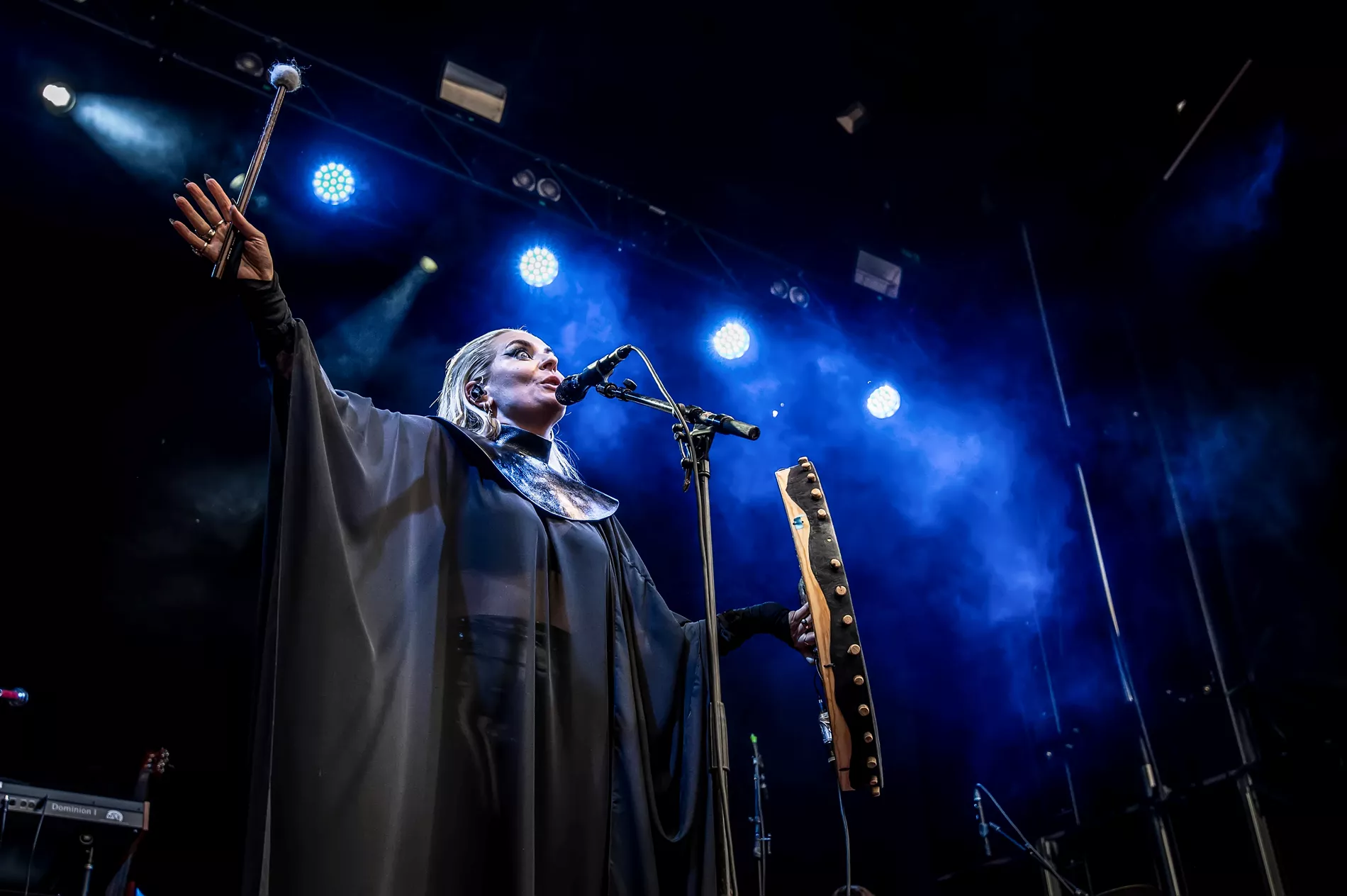 Det är omöjligt att ta blicken ifrån huvudpersonen själv. I svart mantel tornar hon upp sig som en älvdrottning, bankandes på en trumma som ser ut att vara av sälskinn eller plinkandes och hamrandes på en gitarr.
