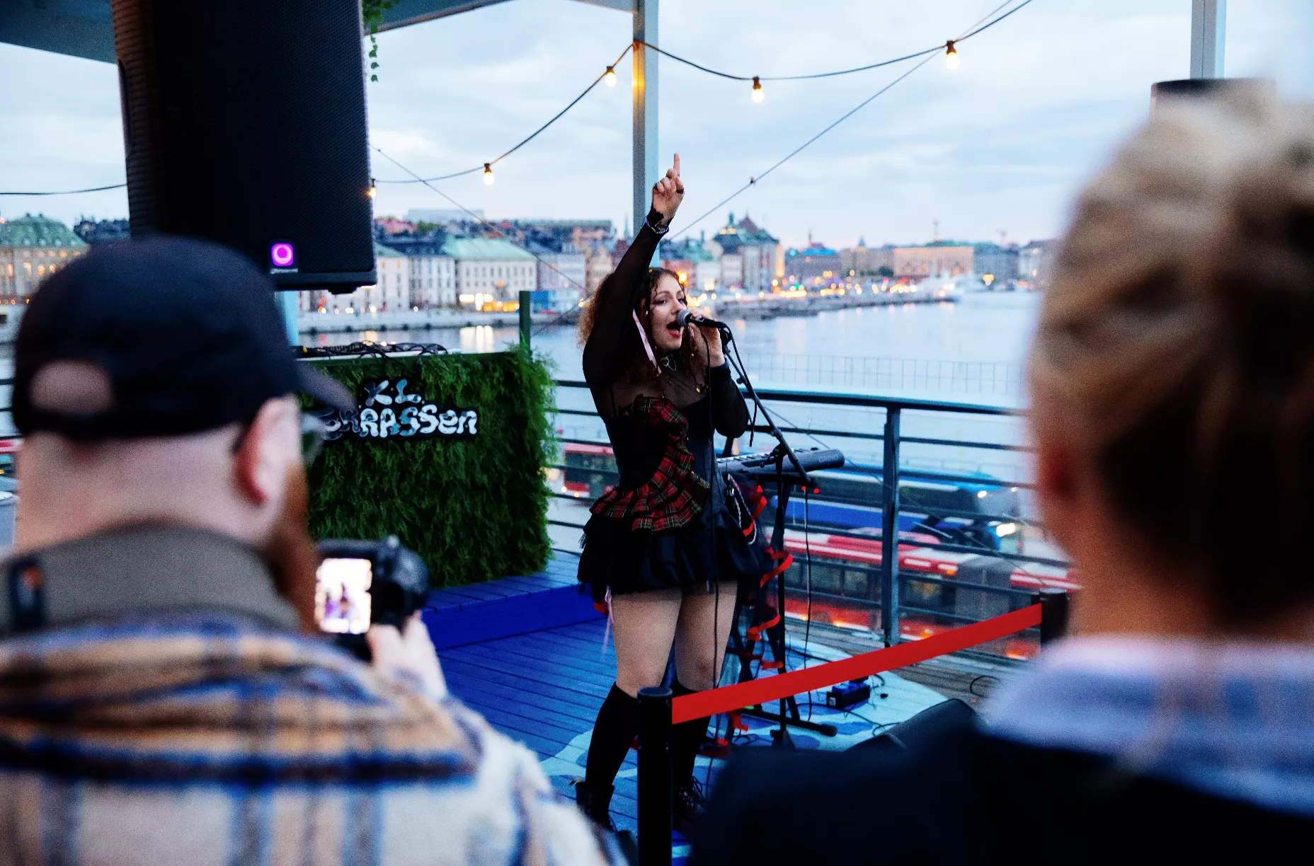 Väl uppe för trapporna möts man av en oas där sorlet redan i full gång. Med trall under fötterna och stadens bästa utsikt mot vattnet finns inga tecken på att man bara är några trappor upp från bussarmadan på andra sidan byggnaden.